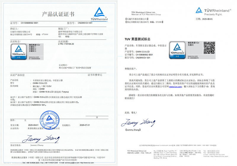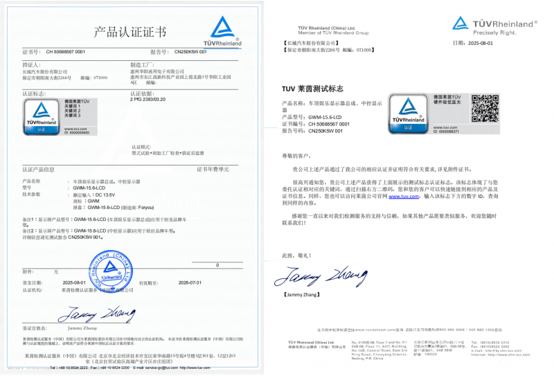 获奖的“灵彩画质”系统是长城汽车在智能座舱光学领域的突破性成果。该系统以全球首发通过TÜV莱茵“眼部舒适度(5星)认证”+“硬件级低蓝光认证”+“无频闪认证”为核心亮点,通过三大眼部关怀认证重新定义了车载显示的视觉健康标准。